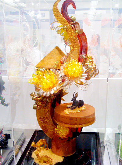 クリオロ初優勝した作品が写真。(下記左)エジプトをテーマにした作品です。この時の作品は本当に美しく、ジャパンケーキショーの会場でもひときわ目立っていました。連合会会長賞ももらって、次の年のチケットに画像が使われたり、副賞でフランス旅行にも行っていました。その隣の写真は初めてコンクールに参加した時の写真。初体験でいろいろ大変だったようです。