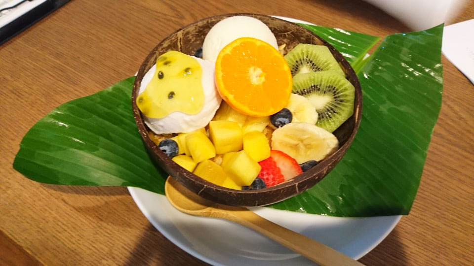 - 宮古島の素材をふんだんに使用した島パフェ。 ココナッツをくり抜いたお皿で、庭に生えてるバナナの葉の上に乗せてます!