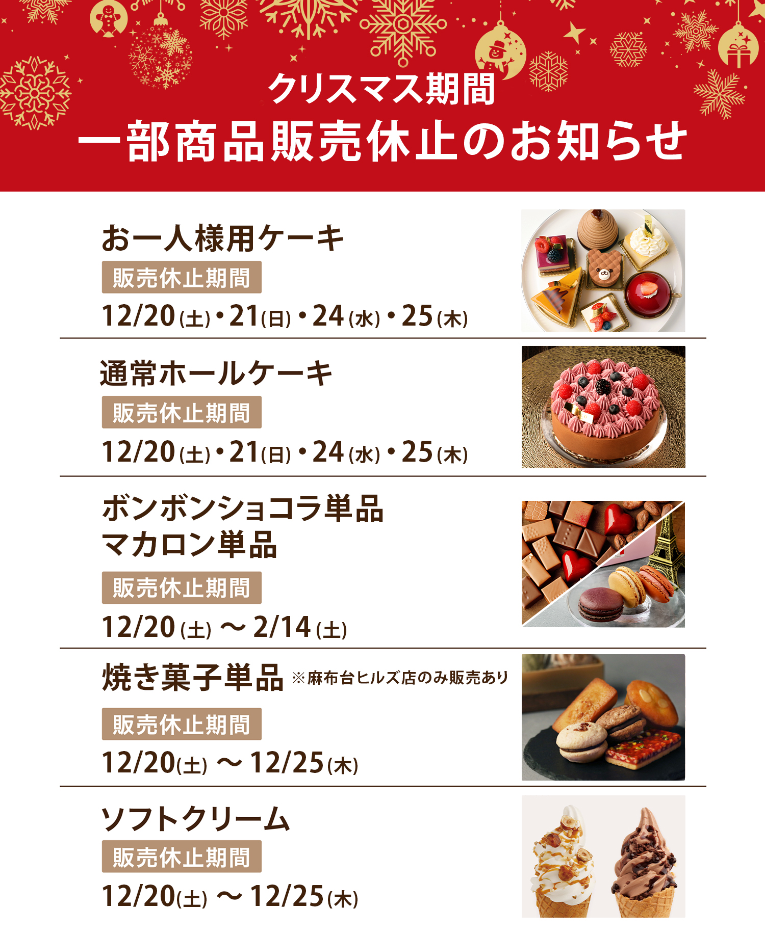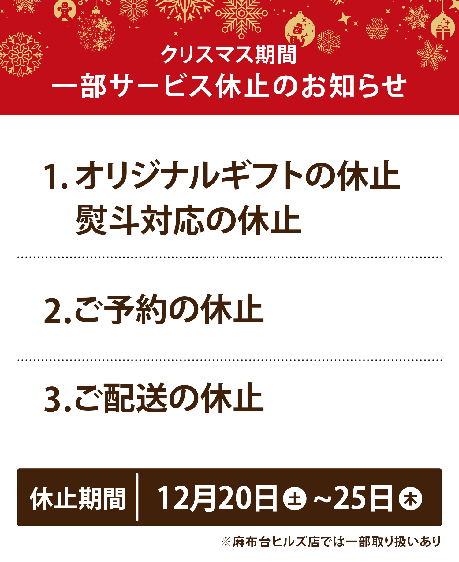 また、クリスマスケーキ販売期間は大変混雑が予想されるため、オリジナルギフトと一部商品をお休みさせていただきます。店頭にあるギフトセットからお選びいただくか、上記期間を外してのご来店をお願いいたします。