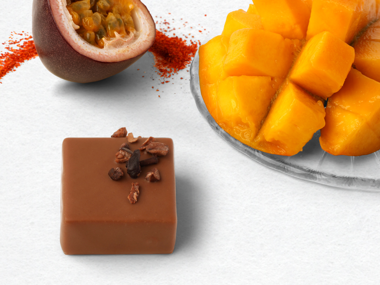 マンゴーとパッションフルーツの甘酸っぱさの後に広がる、一味唐辛子のキレのある辛み。トロピカルフルーツの華やかな味わいにピリッとアクセントを加えた、印象的な一粒です。