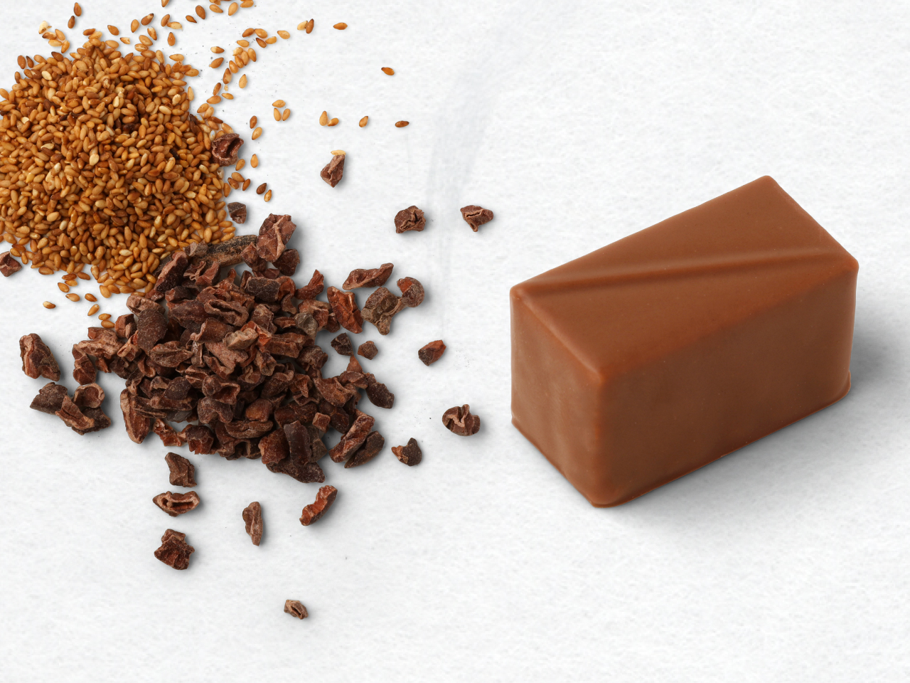 フランス伝統の「プラリネ」に、香ばしい風味が“和”を感じさせる金いりごまを大胆に融合。特有の力強い香りとコクが口いっぱいに広がります。カカオニブのカリッとした食感とほろ苦さが、程よいアクセントに。