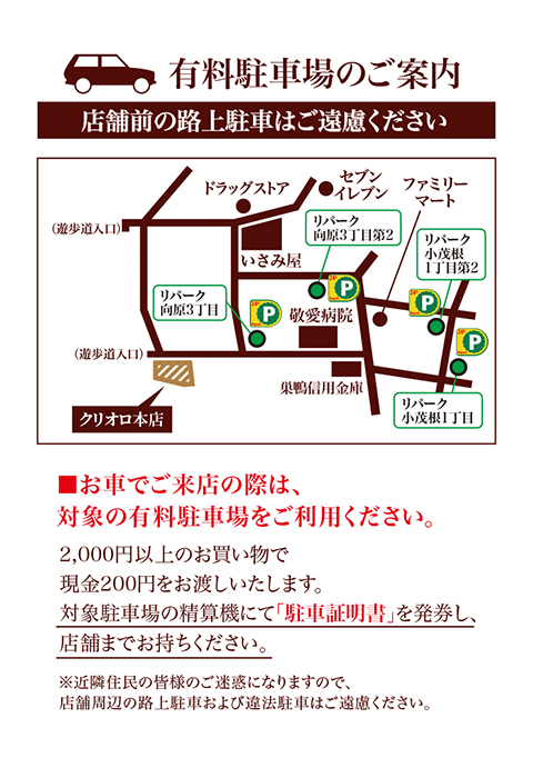※当店は駐車場を完備しておりません。車でお越しのお客様には近くのコインパーキングの利用をお願いいたします。