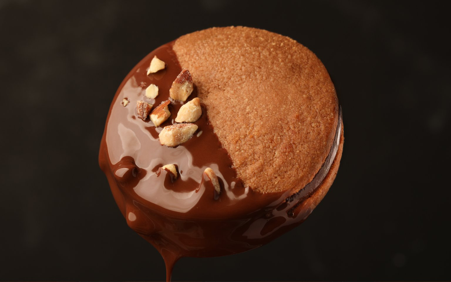 チョコレートペーストを練り込んだ、サクほろ食感のサブレに、口どけなめらかなキャラメルガナッシュをサンド。ナッツの香ばしさとコクが、味わいに深い奥行きをもたらします。仕上げにチョコレートをディップし、より一層贅沢な味わいに。